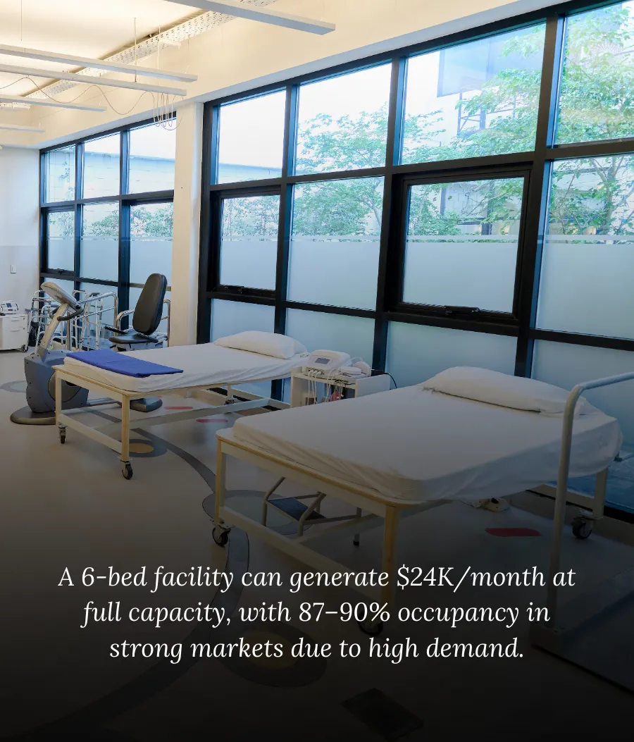 A 6-bed licensed facility with residents paying $4,000 per month generates $24,000 in monthly revenue when full. Occupancy potential reaches 87% in optimized markets. Some markets exceed 90 percent. When facilities are built correctly, beds fill because the demand is there.